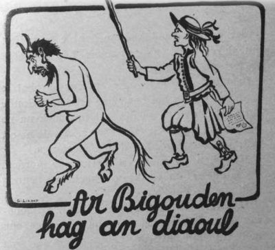 Le retour du pardon semble difficile à cette jeunesse à une époque ou l’alcoolisme sévit durement : Gwazed ha merc’hed dorn ha dorn a ‘z a da duriañ an hentoù …savet gant poan er-maez ar pri war ur bern mein war benn o fri ! Goulenn pardon ouzh Doue, Nerzh na evfac’h birviken re. ( Hommes et femmes, main dans la main titubent dans les chemins … tombent dans la boue s’écorchent le nez sur les pierres ! Demandez pardon à Dieu, que vous ne buviez plus jamais trop !)